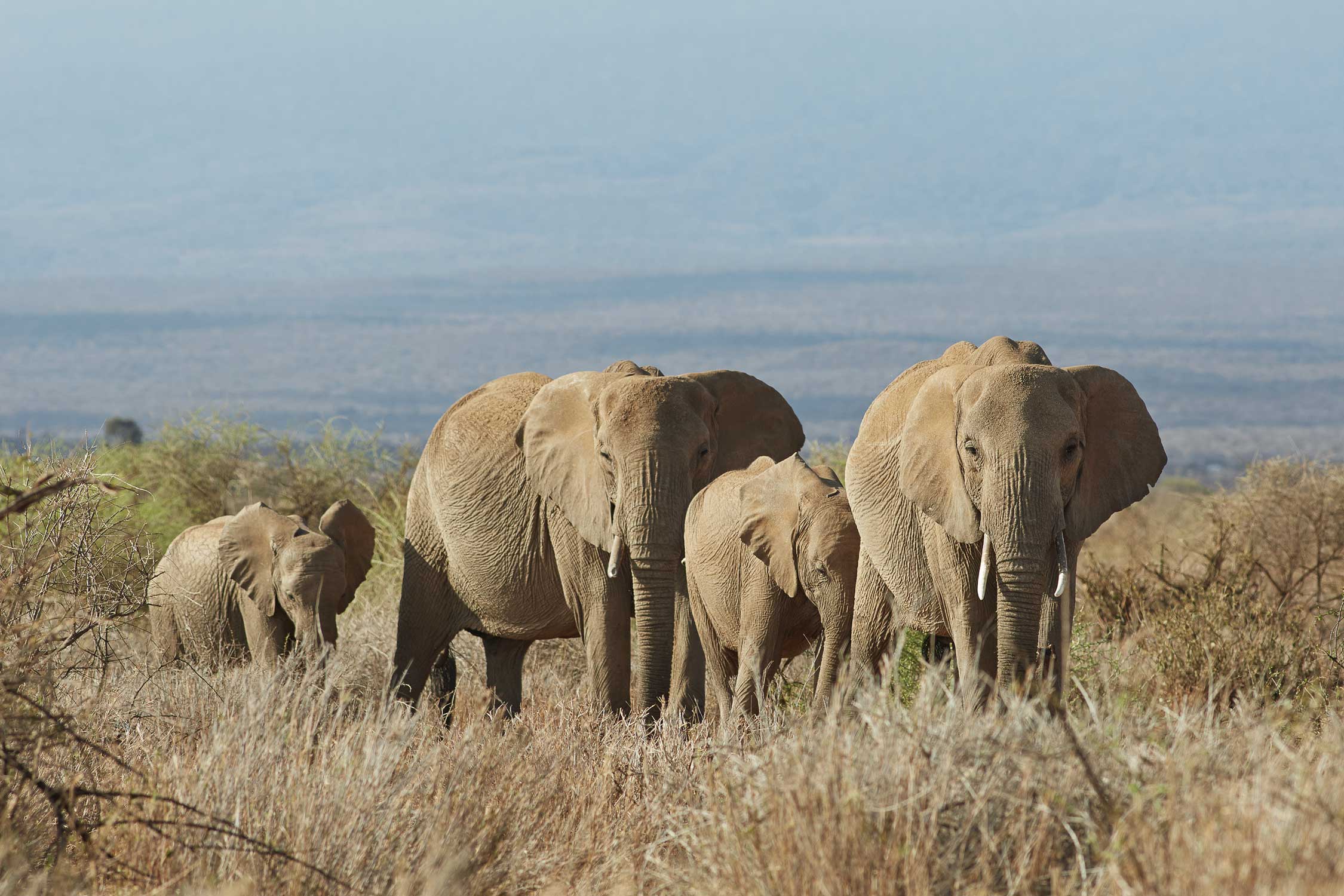 Herd of Elephants following the matriach through Oldepe, Amboseli |