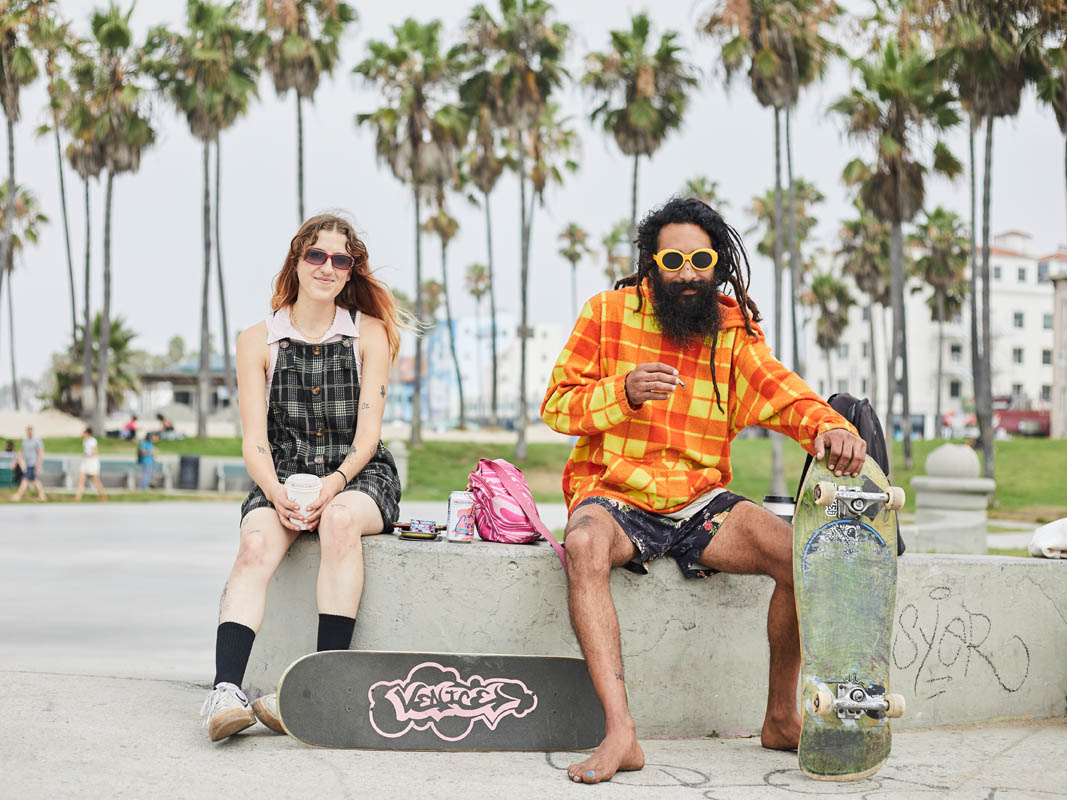 Derek, AKA OG, drawing a hopscotch on the sidewalk while opening up his shop, Venice Beach, California |